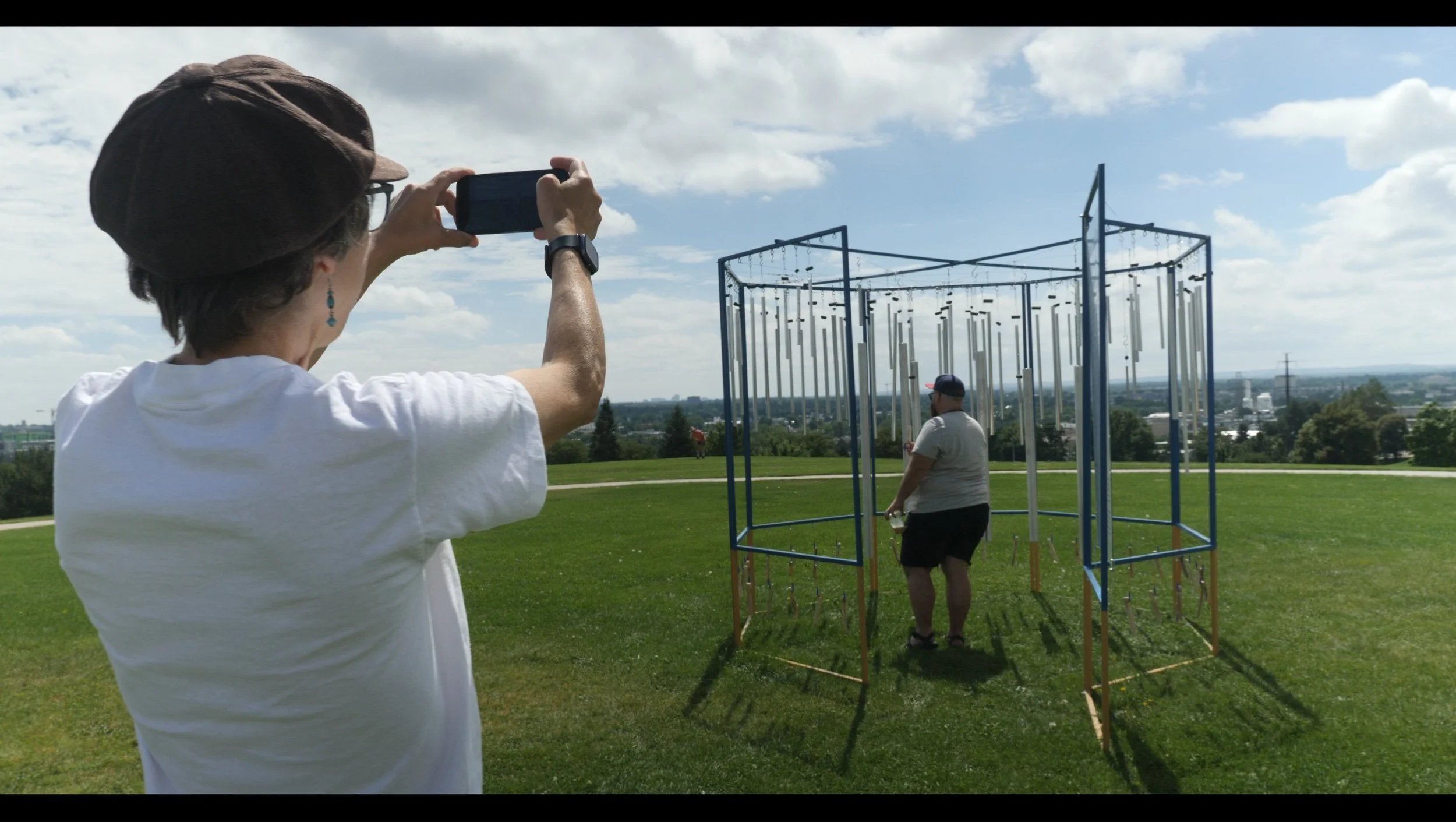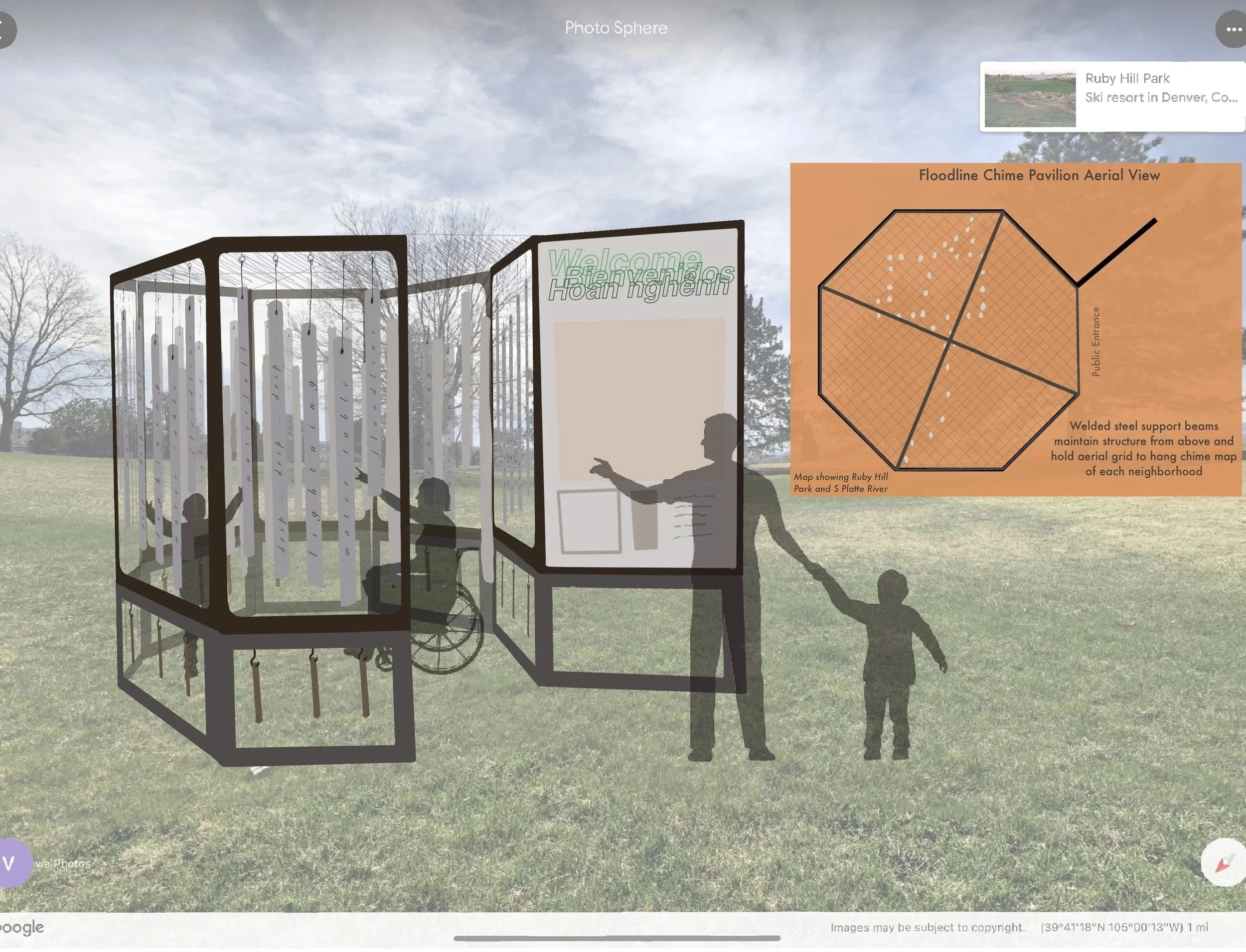 Floodline Chime Pavilion is a temporary, modular, interactive sculpture created for public activation during community events. This steel pavilion suspends around 100 aluminum chimes, many laser-etched, that loosely map the floodplain levels of specific Denver neighborhoods. The length of the selected chimes and the deepness of their tones correspond to the areas’ flood history and potential risk along a floodway. Using handheld strikers, made of wood collected from Platte River floods, participants are encouraged to enter the pavilion and gently strike the chimes to allow their tones to ring out throughout the surrounding public space. Additionally, the pavilion is activated with short performances for singers and chimes with two original compositions. These compositions capture the poetic, tragic, and hopeful journeys that water-related natural disasters can lead to, using mitigation-inspired poetic language woven into the lyrics. The pavilion was debuted in the summer months of 2023 in Ruby Hill, Overland Park, and Globeville.